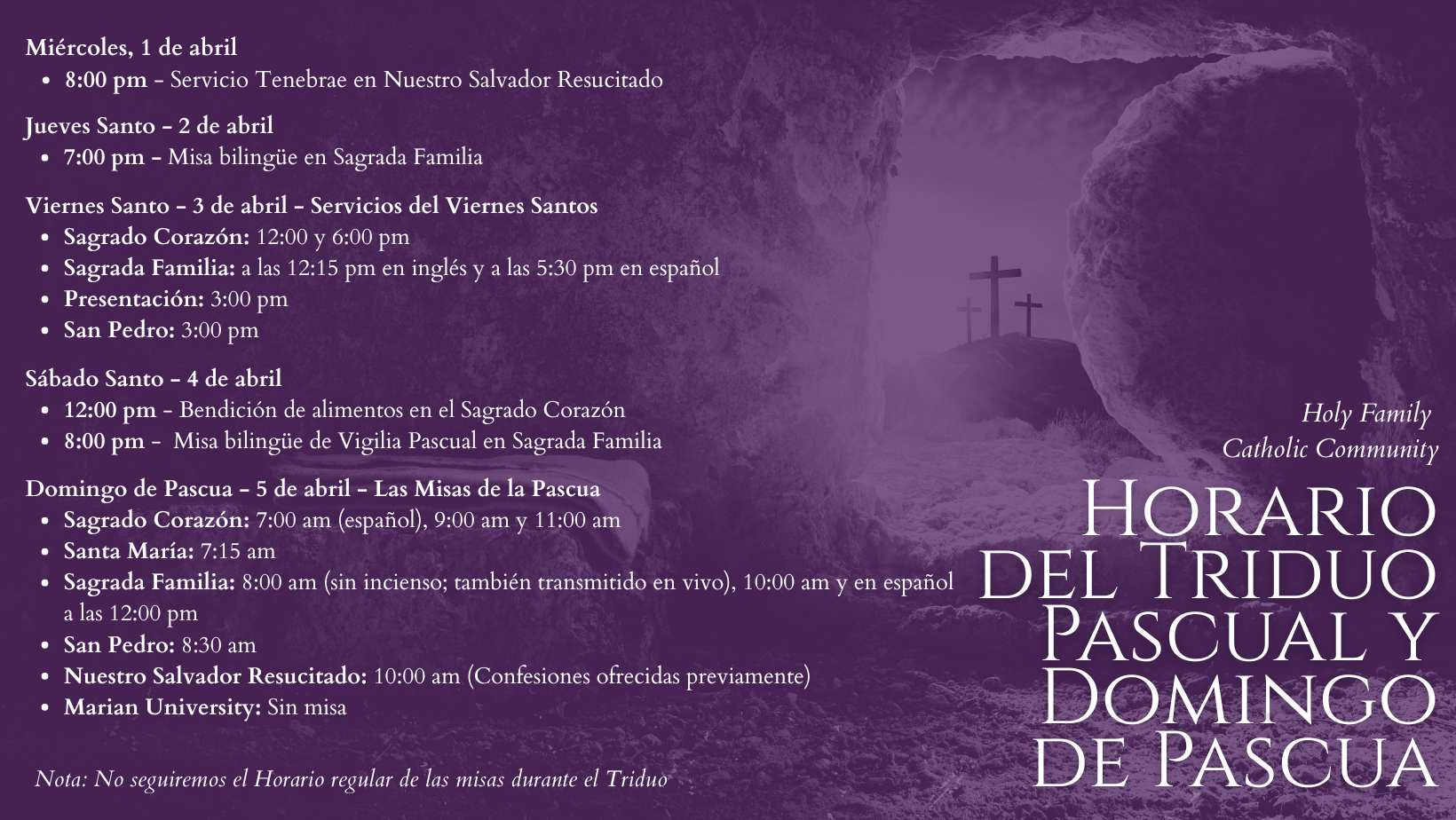 Due to emergency plumbing issues, the 10:00 am Mass at Presentation of the Blessed Virgin Mary Church is cancelled on Sunday, April 12. At this time, we hope to begin offering Adoration again at Presentation mid-next week (week of April 12). Debido a problemas urgentes de fontanería, la Misa de las 10:00 a. m. en la Iglesia de la Presentación de la Santísima Virgen María queda cancelada el domingo 12 de abril. En este momento, esperamos reanudar la Adoración en la Presentación a mediados de la próxima semana (la semana del 12 de abril).