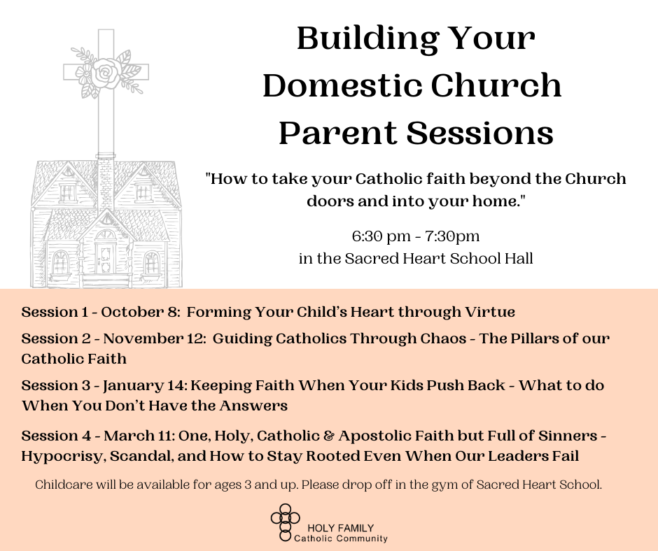 Learn how to take the Catholic faith out of the doors of the church and into your home at our Building the Domestic Church sessions! Each session will include a lesson by one of our priests on a topic related to raising your family in the Catholic faith, a sharing from one our parish couples, a challenge to live out the topic, and free resources to take home. Sessions meet throughout the year on Wednesdays from 6:30 to 7:30 pm in Sacred Heart School Hall. ***You can attend as many sessions as you would like, no registration required. *** To see upcoming sessions, please click the button below.