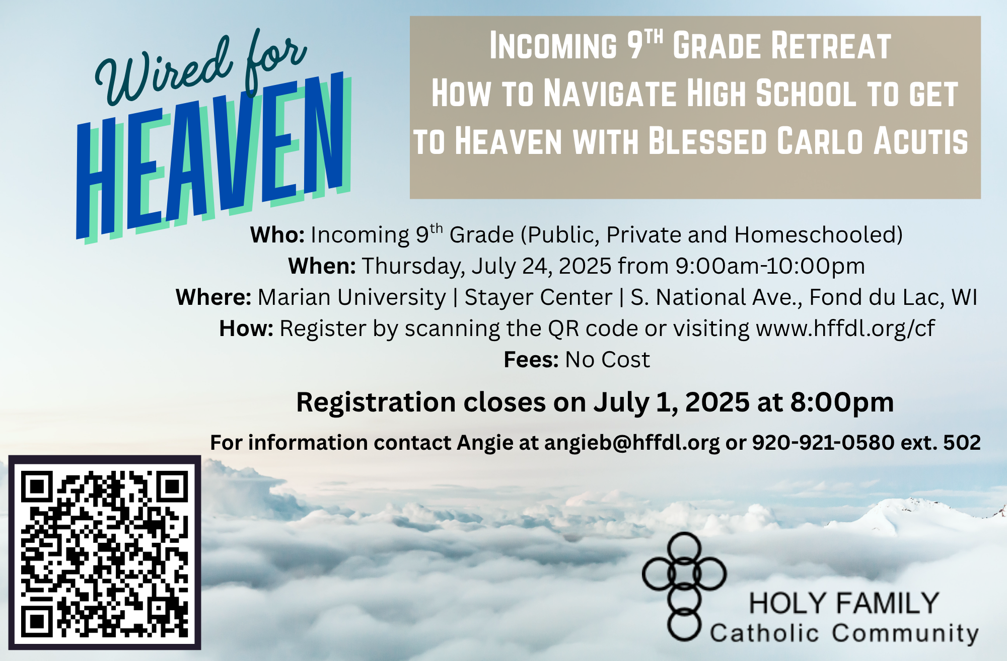 Are you looking for an experience that will evangelize, equip, and empower you to become a radical and joyful disciple? Then consider joining Holy Family for the Steubenville Conference in Joliet, Illinois June 26-28, 2026. Enjoy keynote speakers, praise and worship, Eucharistic Adoration, Reconciliation, and much more at the Conference! Twenty spots are available, which will be given out on a first-come, first-served basis.