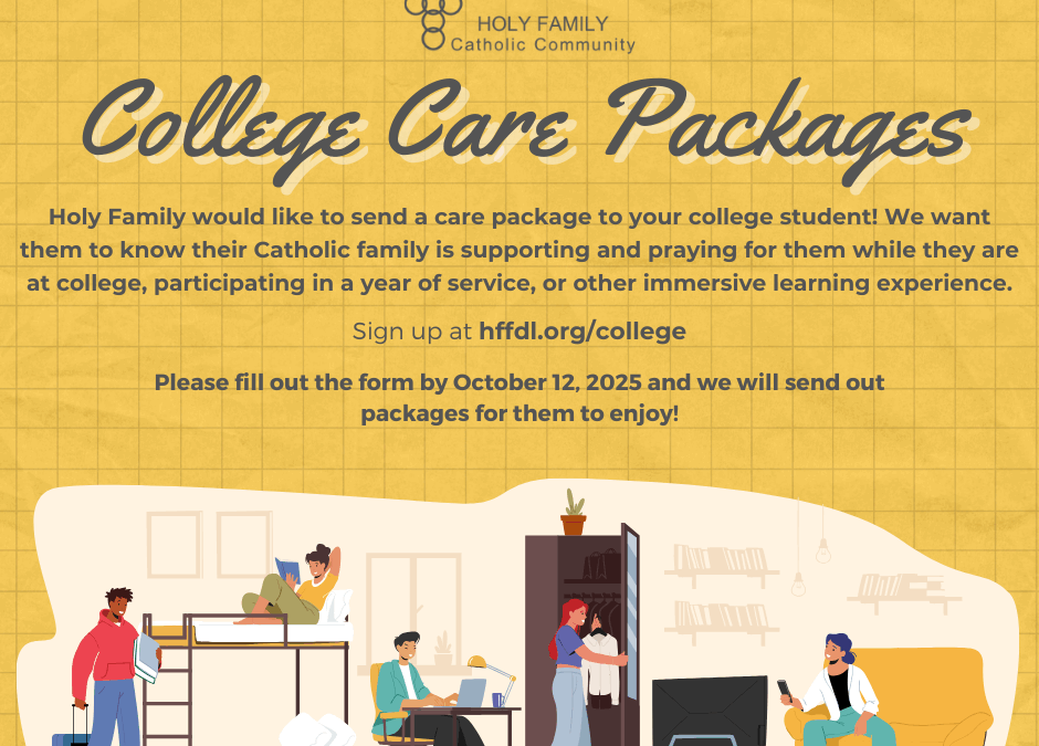 Holy Family would like to send a care package to your college student! We want them to know their Catholic family is supporting and praying for them while they are at college, participating in a year of service, or other immersive learning experience. Please fill out the form below by October 12, 2025 and we will send out packages for them to enjoy!