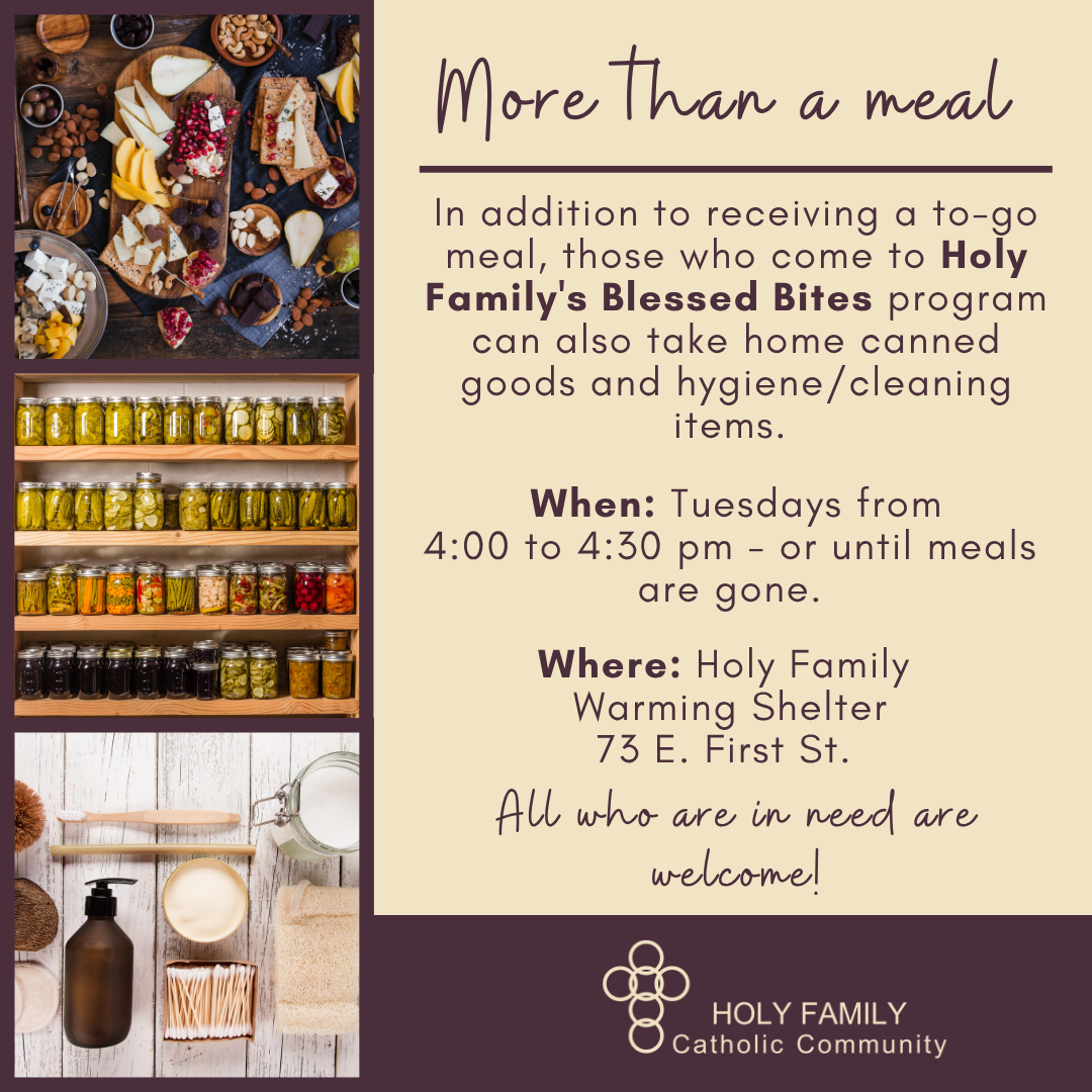 Every Tuesday at the Holy Family Warming Shelter, 73 E. First St., those in need can get a free to-go meal, canned goods, and hygiene/cleaning items through the Blessed Bites program. Items are available from 4:00 to 4:30 pm – or until meals are gone. All who are in need are welcome.
