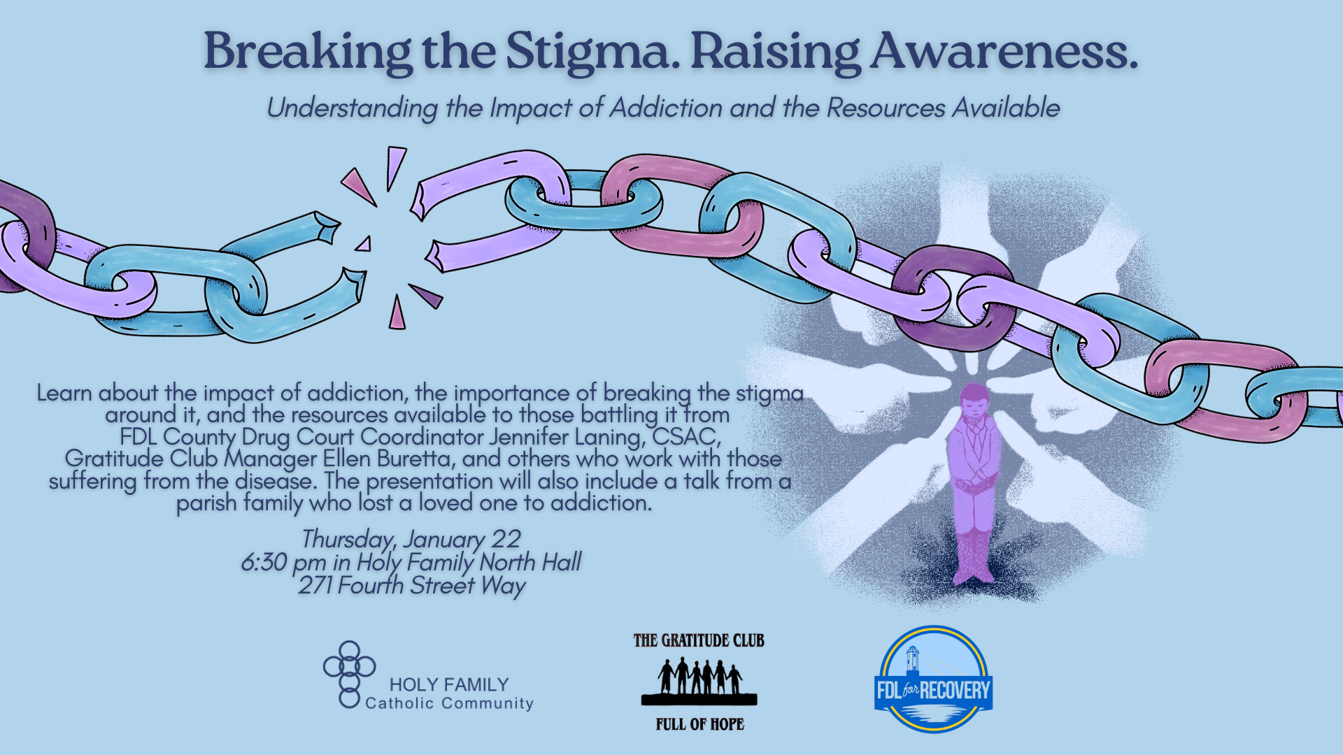 On Thursday, January 22, learn about the impact of addiction, the importance of breaking the stigma around it, and the resources available to those battling it from FDL County Drug Court Coordinator Jennifer Laning, CSAC, Gratitude Club Manager Ellen Buretta, and others who work with those suffering from the disease. Taking place in Holy Family Hall at 6:30 pm, the presentation will also include a talk from a parish family who lost a loved one to addiction.