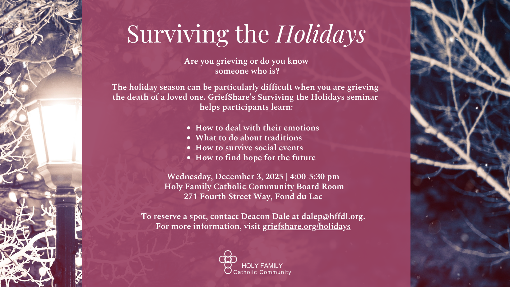 Are you or someone you know grieving? The holiday season can be difficult for those who have lost a loved one. To help you through this time, Holy Family will host GriefShare’s “Surviving the Holidays” seminar from 4:00 to 5:30 pm on Wednesday, December 3 in the Holy Family Board Room.