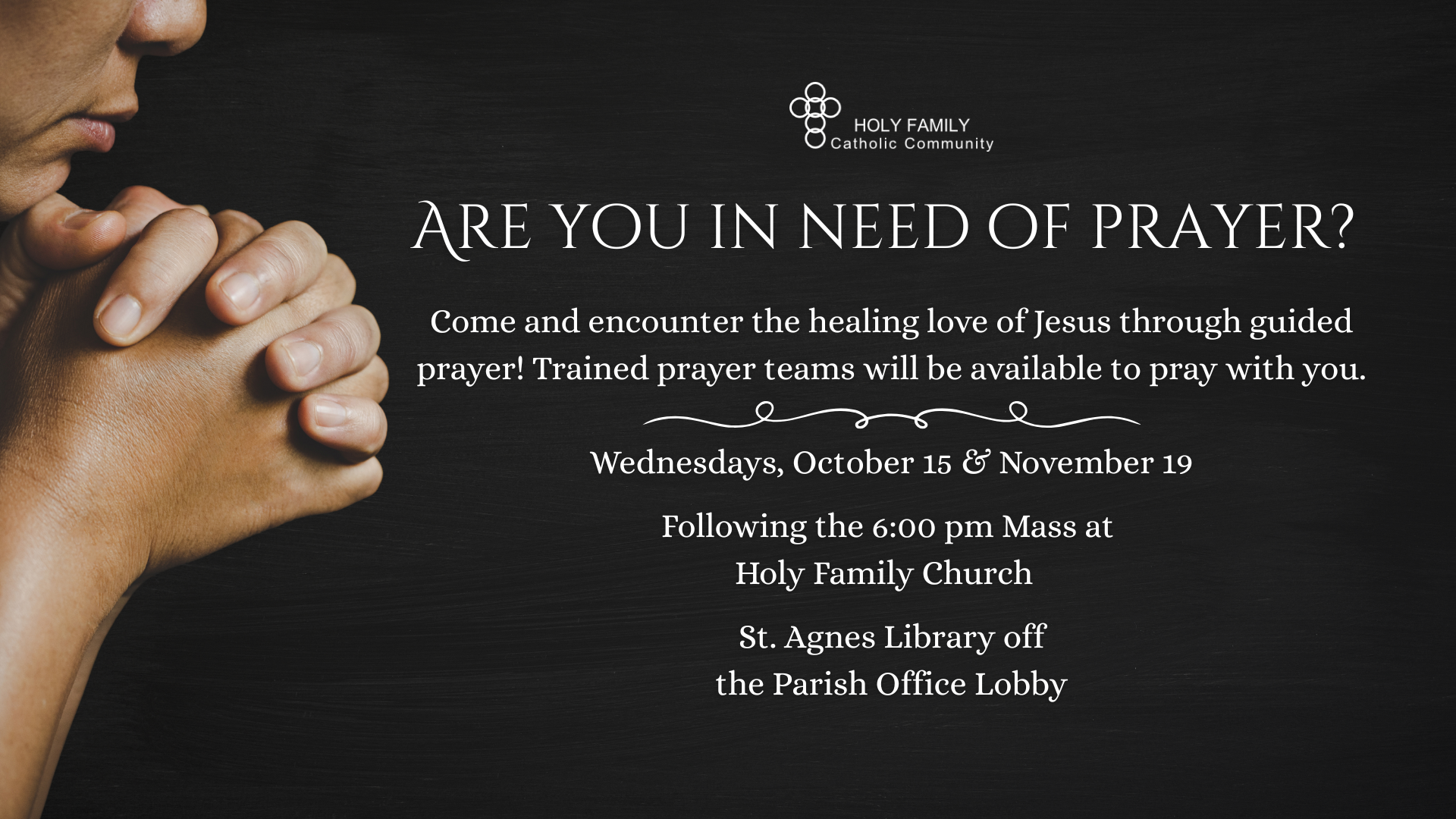 If you are in need of prayer, come and encounter the healing love of Jesus through guided prayer. Trained prayer teams will be available to pray with you on Wednesdays, October 15 and November 19 following the 6:00 pm Mass at Holy Family Church in the St. Agnes Library.