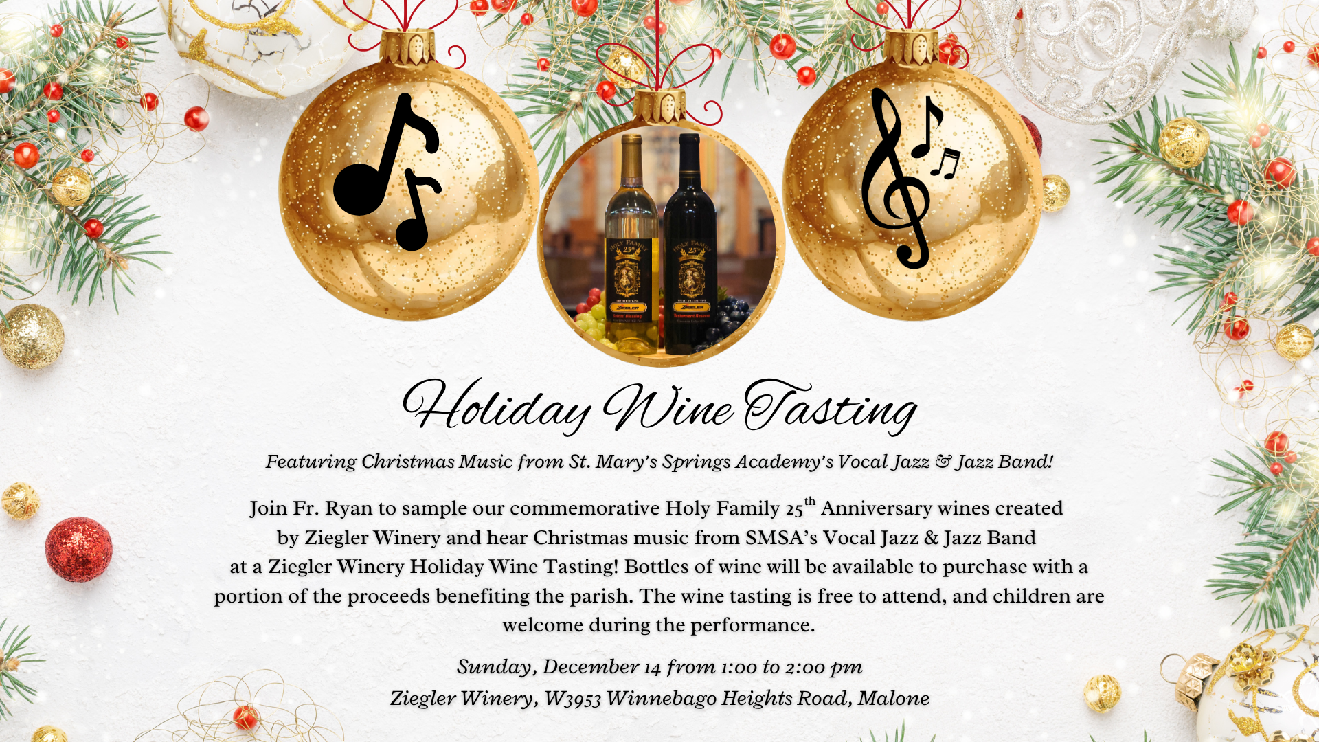 From 1:00 to 2:00 pm on Sunday, December 14, join Fr. Ryan Pruess to sample our commemorative Holy Family 25th Anniversary wines created by Ziegler Winery and hear Christmas music from St. Mary’s Springs Academy’s Vocal Jazz & Jazz Band at a Ziegler Winery Holiday Wine Tasting! Bottles of wine will be available to purchase with a portion of the proceeds benefiting the parish.