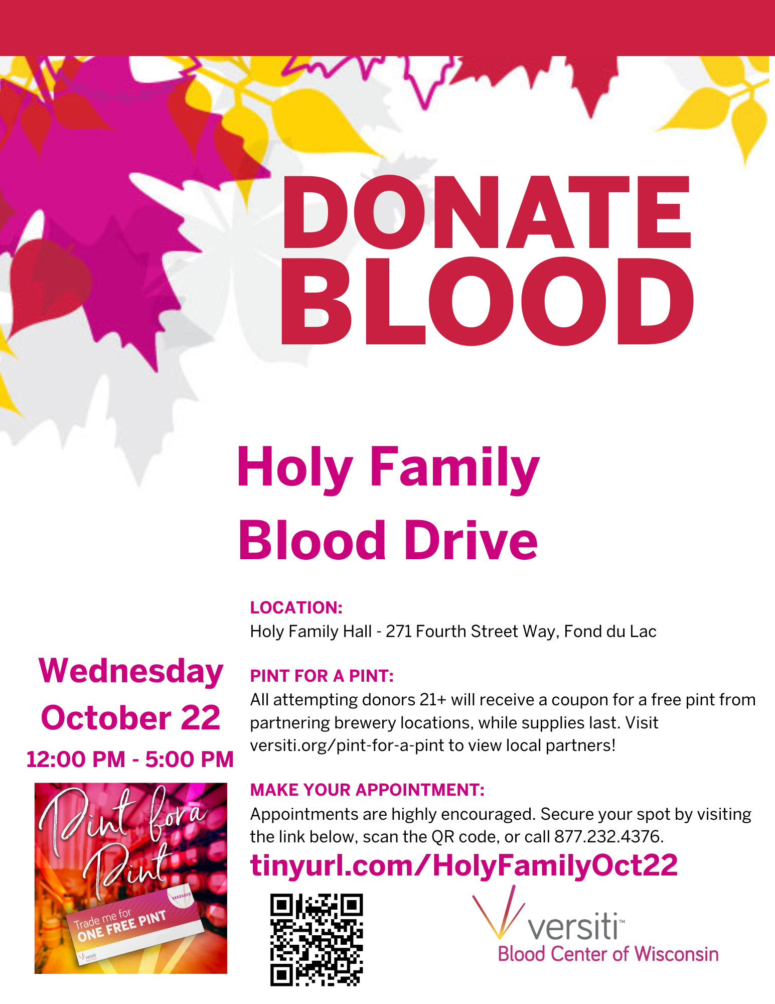 Help save lives when you donate blood at our Holy Family Blood Drive on Wednesday, October 22 from 12:00 to 5:00 pm in Holy Family Hall. All attempting donors age 21 and over will receive a free pint from partnering brewery locations while supplies last. Appointments are highly encouraged. To make an appointment, please visit tinyurl.com/HolyFamilyOct22 or call 1-877-232-4376.