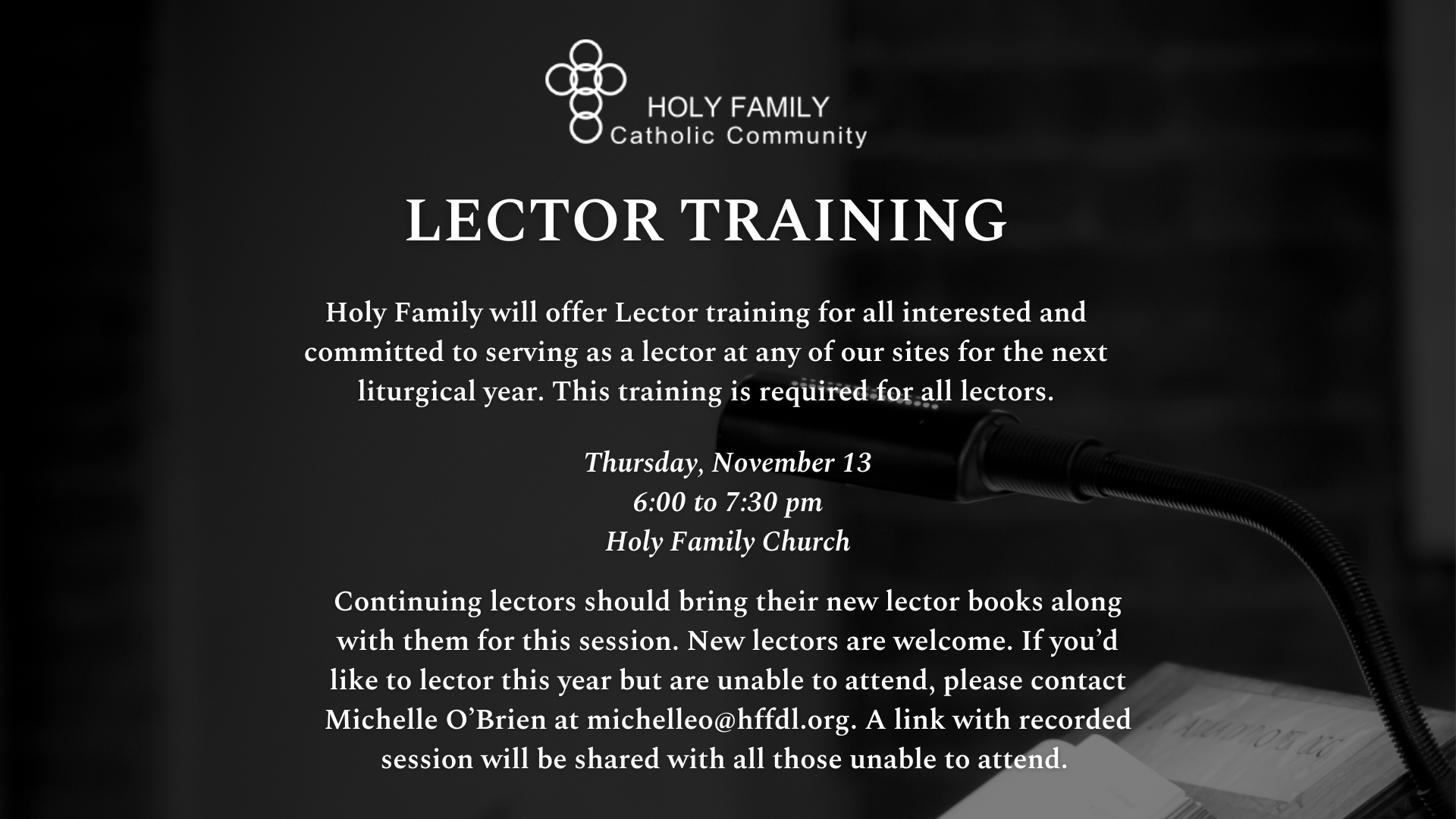 All interested and committed to serving as a lector at any of our churches for the next liturgical year should attend our lector training on Thursday, November 13 at 6:00 pm in Holy Family Church. Continuing lectors should bring their new lector books along with them for this session. New lectors are welcome. If you’d like to lector this year but are unable to attend, please contact Michelle O’Brien at michelleo@hffdl.org. A link with recorded session will be shared with all those unable to attend.