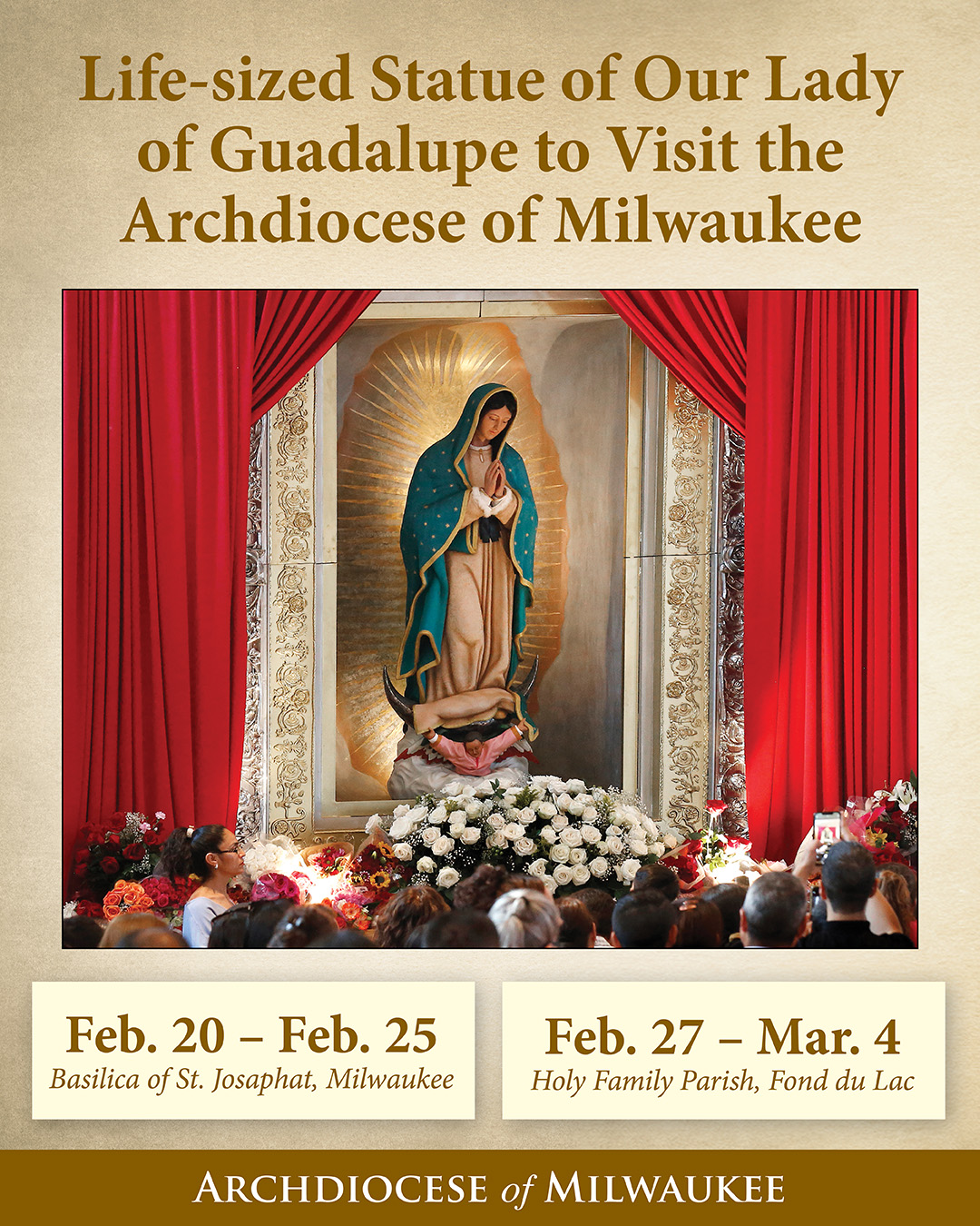 Witness history as the “Madre Peregrina” (Pilgrim Mother) statue of Our Lady of Guadalupe passes through the Archdiocese of Milwaukee on its international tour. Our parish will offer a presentation and veneration of the life-size statue of Madre Peregrina from Friday, February 27 to Wednesday, March 4. The statue’s arrival in Fond du Lac will be celebrated by a Mass with Auxiliary Bishop James Schuerman at 6:00 pm on Friday, February 27.