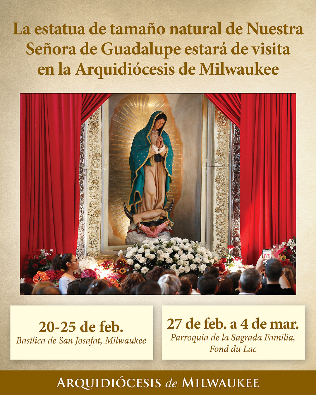 Sea testigo de un evento histórico mientras la estatua de la “Madre Peregrina” de Nuestra Señora de Guadalupe recorre la Arquidiócesis de Milwaukee en su gira internacional. Nuestra parroquia tiene la dicha de tenerla en nuestra comunidad, presentación y veneración de la estatua de tamaño natural de la Madre Peregrina desde el viernes 27 de febrero hasta el miércoles 4 de marzo. La llegada de María de Guadalupe a Fond du Lac se celebrará con una Misa presidida por el Obispo Auxiliar James Schuerman el viernes 27 de febrero a las 6:00 p. m.