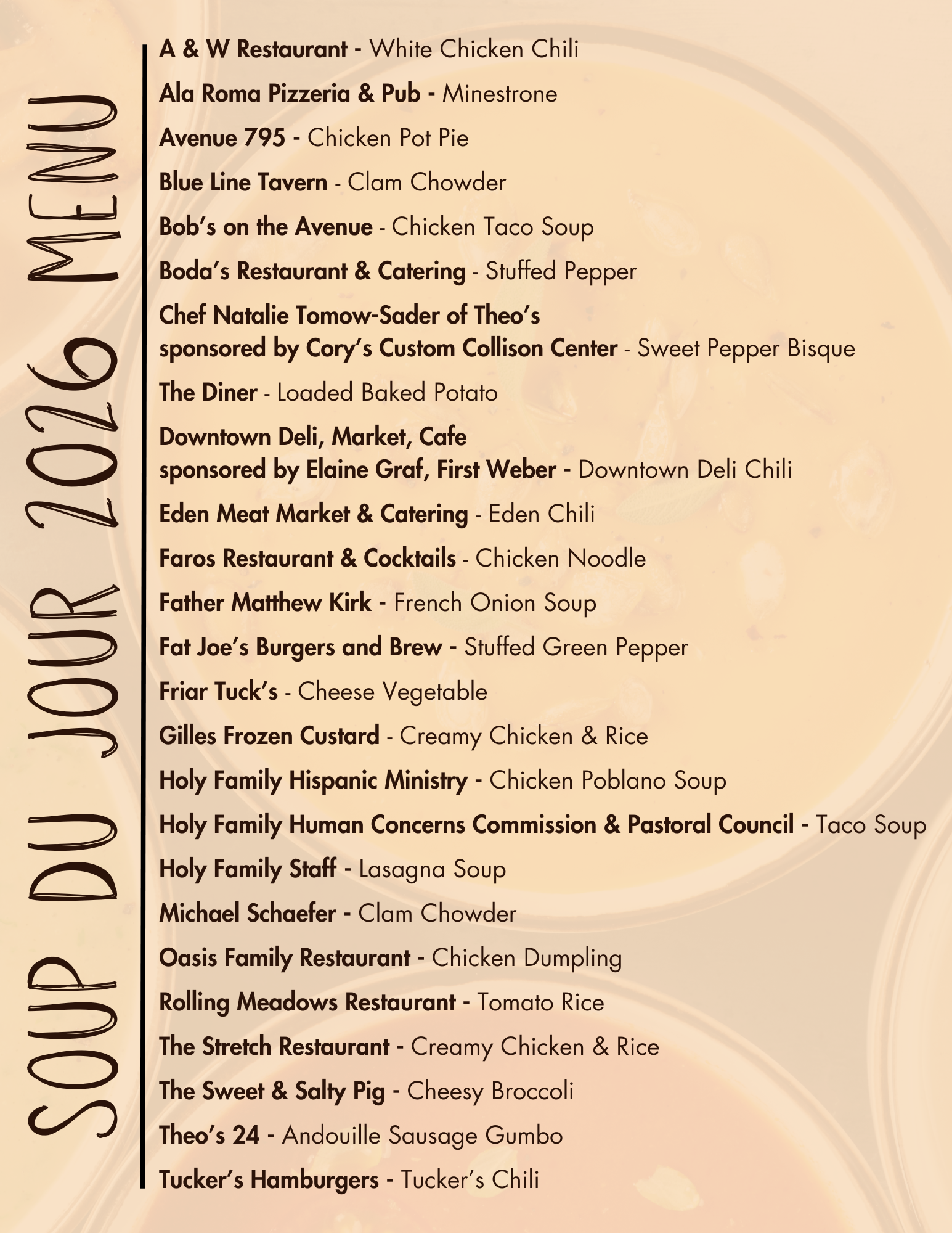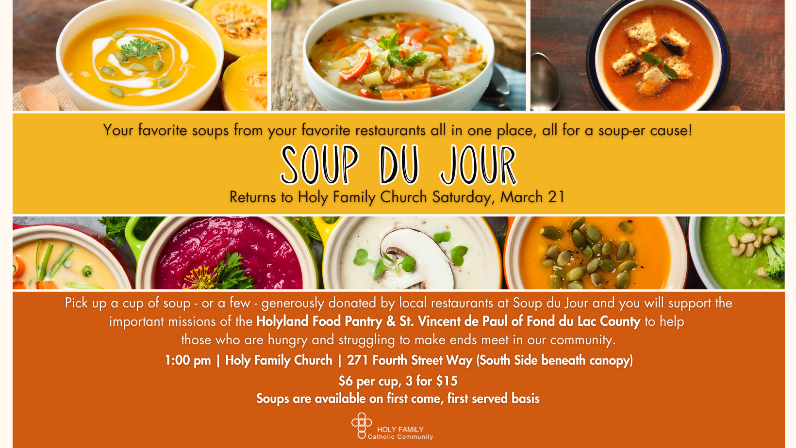 Purchase great soups donated by your favorite Fond du Lac restaurants to benefit those in need when you come to Soup du Jour on Saturday, March 21 at Holy Family Church.