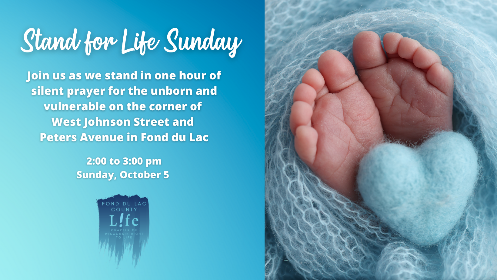 In observance of Respect Life Month, Holy Family invites everyone to participate in the Annual Stand for Life (formerly called Life Chain) – an hour of public silent prayer vigil for the unborn and vulnerable – from 2:00 to 3:00 pm at the corner of West Johnson Street and North Peters Avenue hosted by the Fond du Lac County Chapter of Wisconsin Right to Life.
