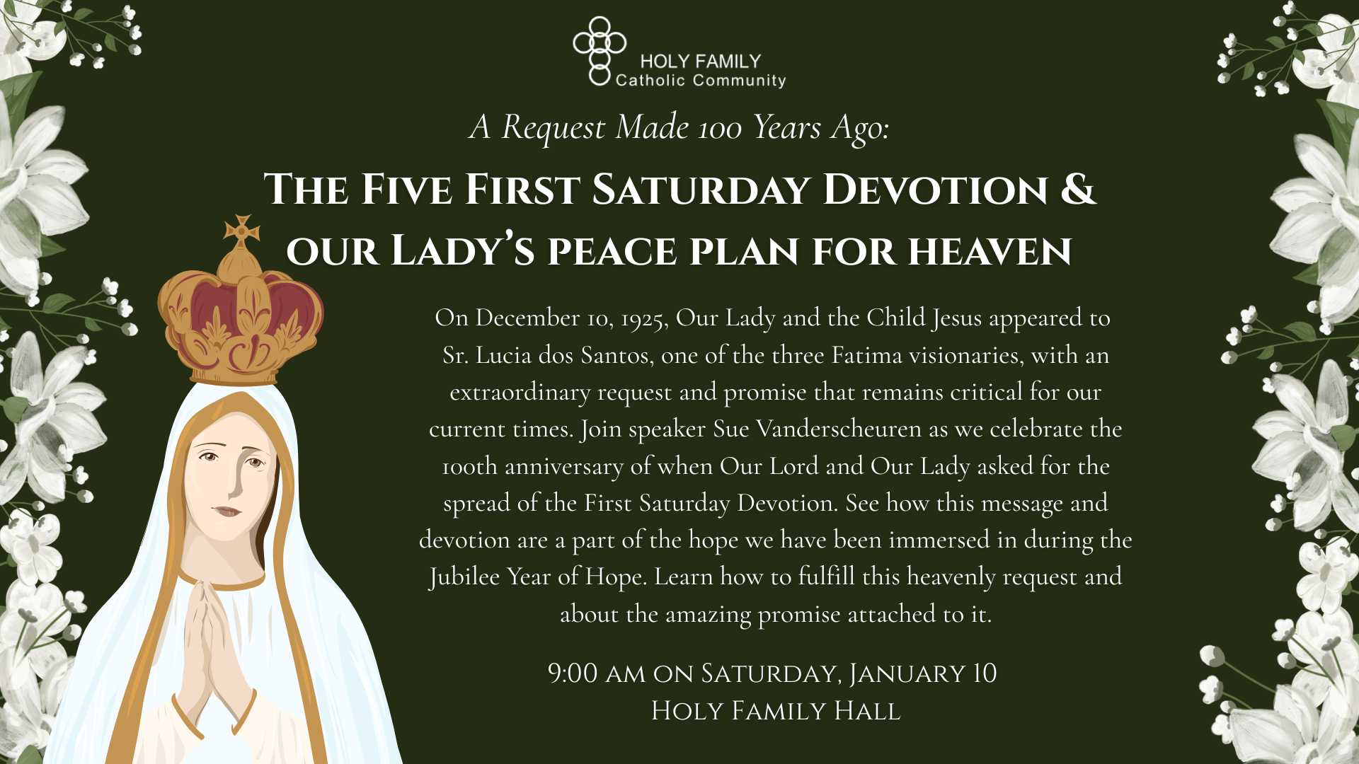 On December 10, 1925, Our Lady and the Child Jesus appeared to Sr. Lucia dos Santos, one of the three Fatima visionaries, with an extraordinary request and promise that remains critical for our current times. Join us as we celebrate the 100th anniversary of when Our Lord and Our Lady asked for the spread of the First Saturday Devotion with Sue Vanderscheuren’s talk “The Five First Saturday Devotion & Our Lady’s Peace Plan From Heaven” on Saturday, January 10 at 9:00 am in Holy Family Hall.