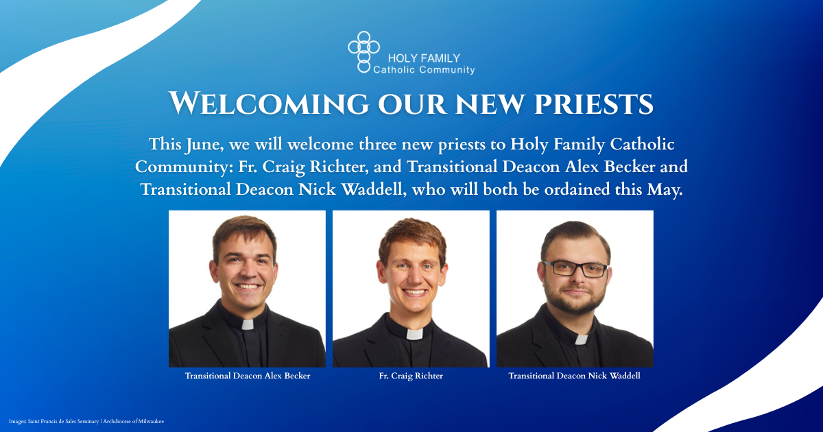 Aunque será difícil verlos partir de nuestra parroquia, consolémonos con la noticia proveniente de la Arquidiócesis de que tres nuevos sacerdotes se unirán también a nuestra comunidad parroquial en junio. A partir del 16 de junio, daremos la bienvenida al Padre Craig Richter, así como a los diáconos transitorios Alex Becker y Nick Waddell, quienes serán ordenados sacerdotes el próximo mes.