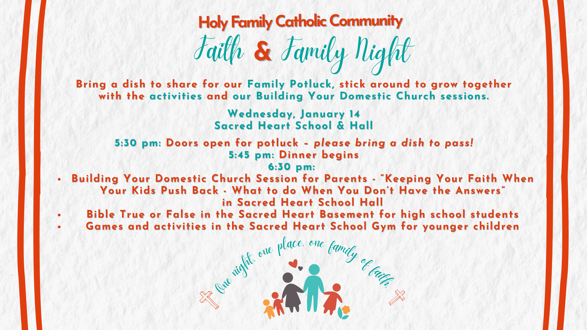 Sacred Heart School 678 Western Ave., Fond du Lac, United StatesFamilies are invited to come to Sacred Heart School on Wednesday, January 14 for our Faith & Family Night! The evening will begin with a potluck. Please bring your dishes by 5:30 pm, with dinner beginning at 5:45 pm. Everyone is encouraged to bring a dish to pass. At 6:30 pm, parents can attend our Building Your Domestic Church session focused on “Keeping Faith When Your Kids Push Back - What to do When You Don’t Have the Answers.” Meanwhile, high school students can head into the basement for Bible True or False Trivia, while younger children stay in the gym for games and activities.